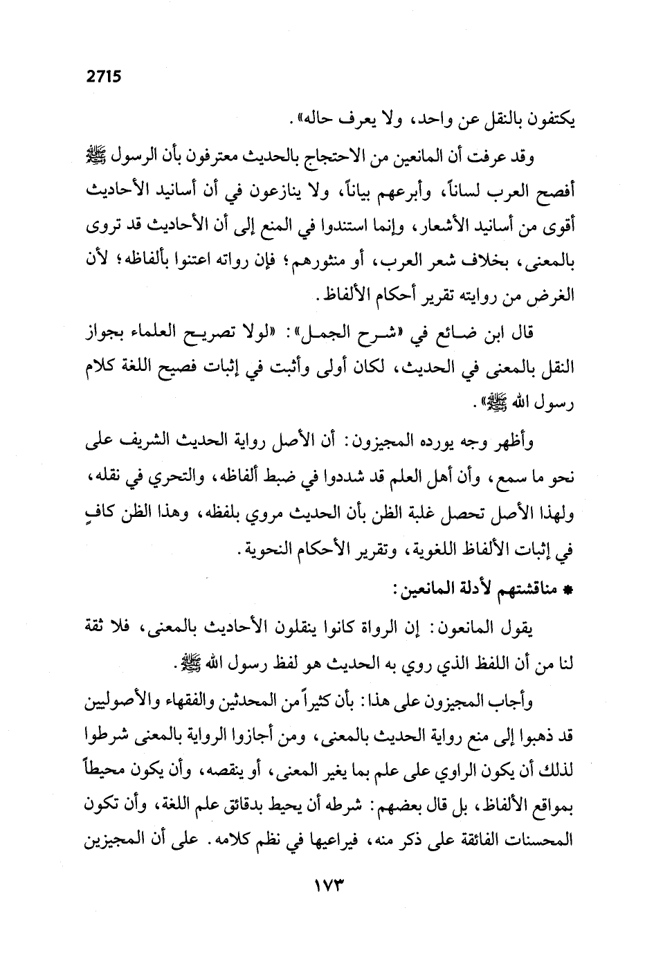 وقد عرفت أن المانعين من الاحتجاج بالحديث معترفون بأن الرسول - صلى الله عليه وسلم - أفصح العرب لساناً، وأبرعهم بياناً، ولا ينازعون في أن أسانيد الأحاديث أقوى من أسانيد الأشعار، وإنما استندوا في المنع إلى أن الأحاديث قد تروى بالمعنى، بخلاف شعر العرب، أو منثورهم؛ فإن رواته اعتنوا بألفاظه؛ لأن الغرض من روايته تقرير أحكام الألفاظ.