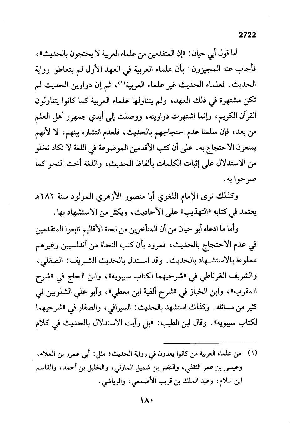 أما قول أبى حيان: "إن المتقدمين من علماء العربية لا يحتجون بالحديث"، فأجاب عنه المجيزون: بأن علماء العربية في العهد الأول لم يتعاطوا رواية الحديث، فعلماء الحديث غير علماء العربية (¬1)، ثم إن دواوين الحديث لم تكن مشتهرة في ذلك العهد، ولم يتناولها علماء العربية كما كانوا يتناولون القرآن الكريم، وإنما اشتهرت دواوينه، ووصلت إلى أيدي جمهور أهل العلم من بعد، فإن سلمنا عدم احتجاجهم بالحديث، فلعدم انتشاره بينهم، لا لأنهم يمنعون الاحتجاج به. على أن كتب الأقدمين الموضوعة في اللغة لا تكاد تخلو من الاستدلال على إثبات الكلمات بألفاظ الحديث، واللغة أخت النحو كما صرحوا به.