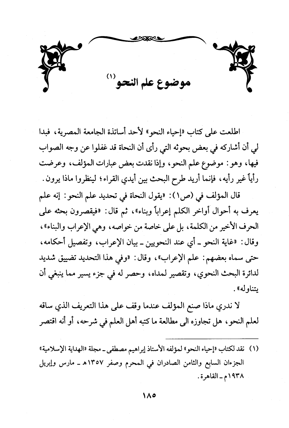(¬1) نقد لكتاب "إحياء النحو" لمؤلفه الأستاذ إبراهيم مصطفى - مجلة "الهداية الإسلامية" الجزءان السابع والثامن الصادران في المحرم وصفر 1357 هـ - مارس وإبريل 1938 م - القاهرة.