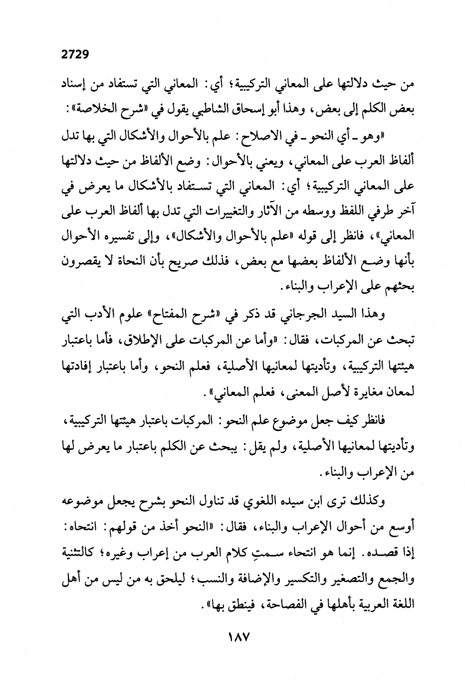 "وهو - أي النحو - في الاصلاح: علم بالأحوال والأشكال التي بها تدل ألفاظ العرب على المعاني، ويعني بالأحوال: وضع الألفاظ من حيث دلالتها على المعاني التركيبية؛ أي: المعاني التي تستفاد بالأشكال ما يعرض في آخر طرفي اللفظ ووسطه من الآثار والتغييرات التي تدل بها ألفاظ العرب على المعاني"، فانظر إلى قوله "علم بالأحوال والأشكال"، وإلى تفسيره الأحوال بأنها وضع الألفاظ بعضها مع بعض، فذلك صريح بأن النحاة لا يقصرون بحثهم على الإعراب والبناء.