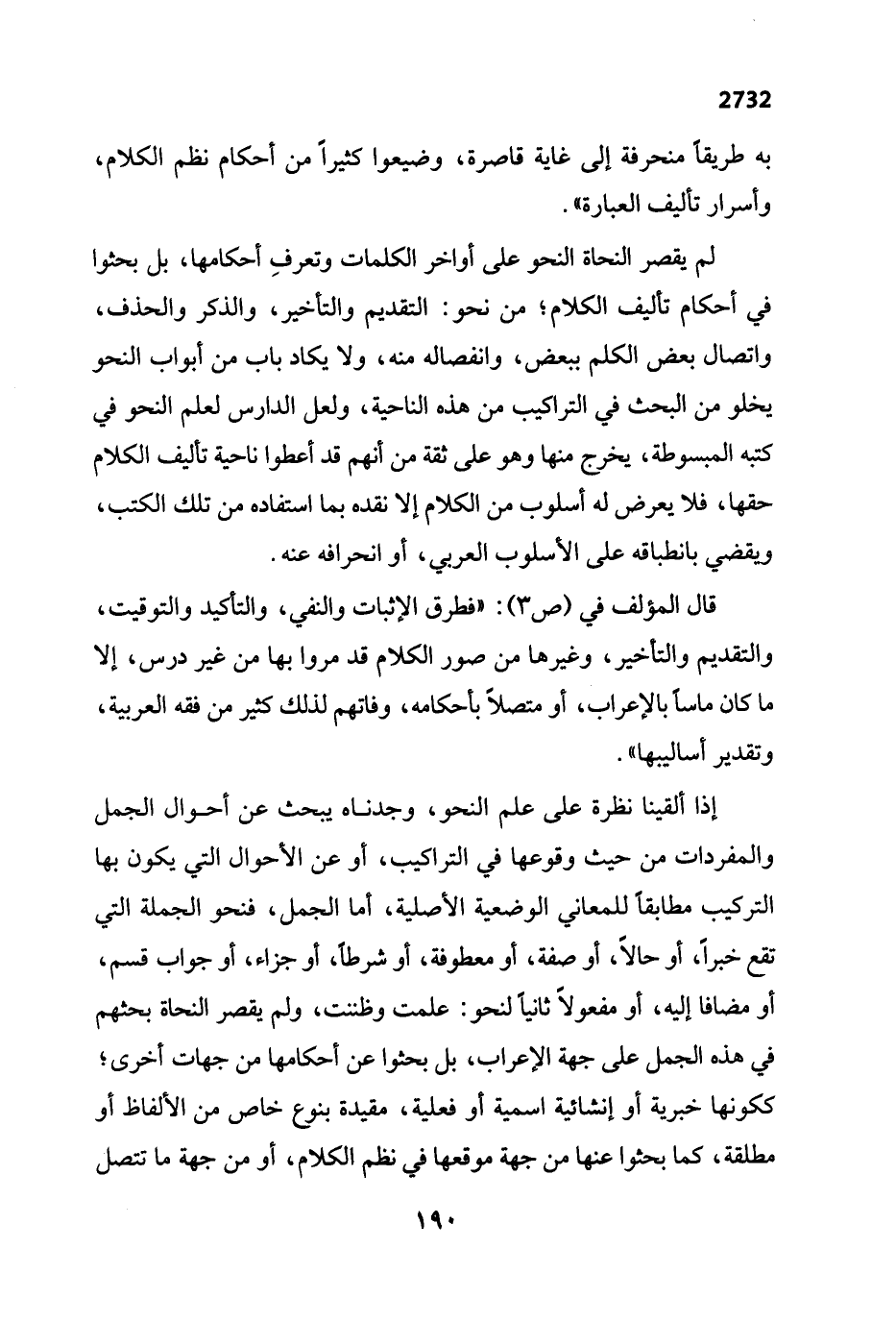 قال المؤلف في (ص 3): "فطرق الإثبات والنفي، والتأكيد والتوقيت، والتقديم والتأخير، وغيرها من صور الكلام قد مروا بها من غير درس، إلا ما كان ماساً بالإعراب، أو متصلاً بأحكامه، وفاتهم لذلك كثير من فقه العربية، وتقدير أساليبها".