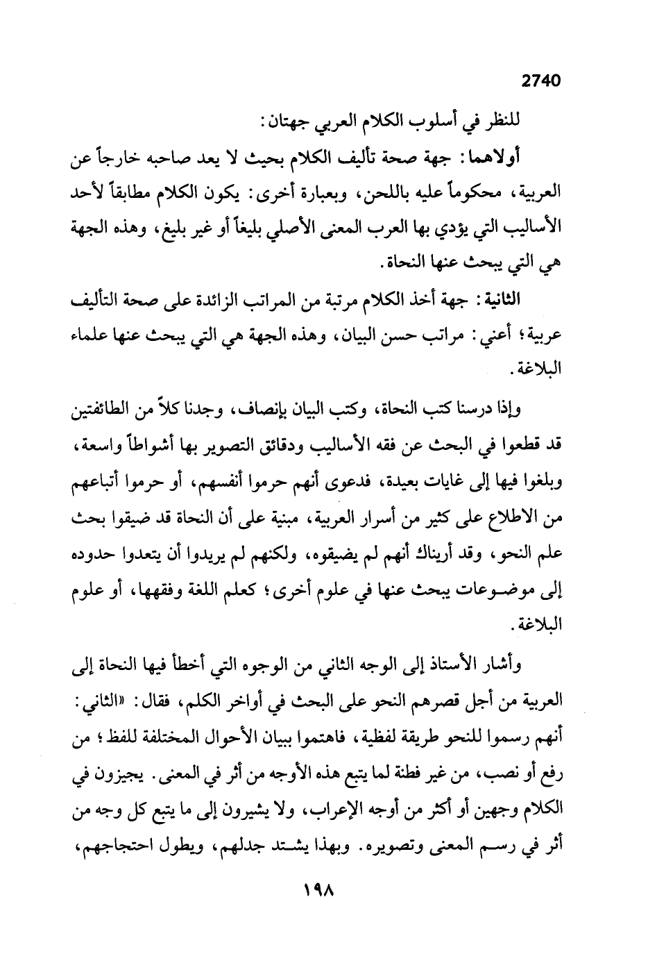 وإذا درسنا كتب النحاة، وكتب البيان بإنصاف، وجدنا كلاً من الطائفتين قد قطعوا في البحث عن فقه الأساليب ودقائق التصوير بها أشواطاً واسعة، وبلغوا فيها إلى غايات بعيدة، فدعوى أنهم حرموا أنفسهم، أو حرموا أتباعهم من الاطلاع على كثير من أسرار العربية، مبنية على أن النحاة قد ضيقوا بحث علم النحو، وقد أريناك أنهم لم يضيقوه، ولكنهم لم يريدوا أن يتعدوا حدوده إلى موضوعات يبحث عنها في علوم أخرى؛ كعلم اللغة وفقهها، أو علوم البلاغة.