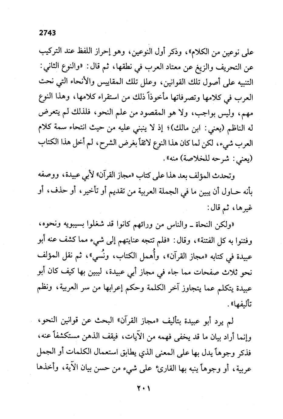 وتحدث المؤلف بعد هذا على كتاب "مجاز القرآن" لأبي عبيدة، ووصفه بأنه حاول أن يبين ما في الجملة العربية من تقديم أو تأخير، أو حذف، أو غيرها، ثم قال: