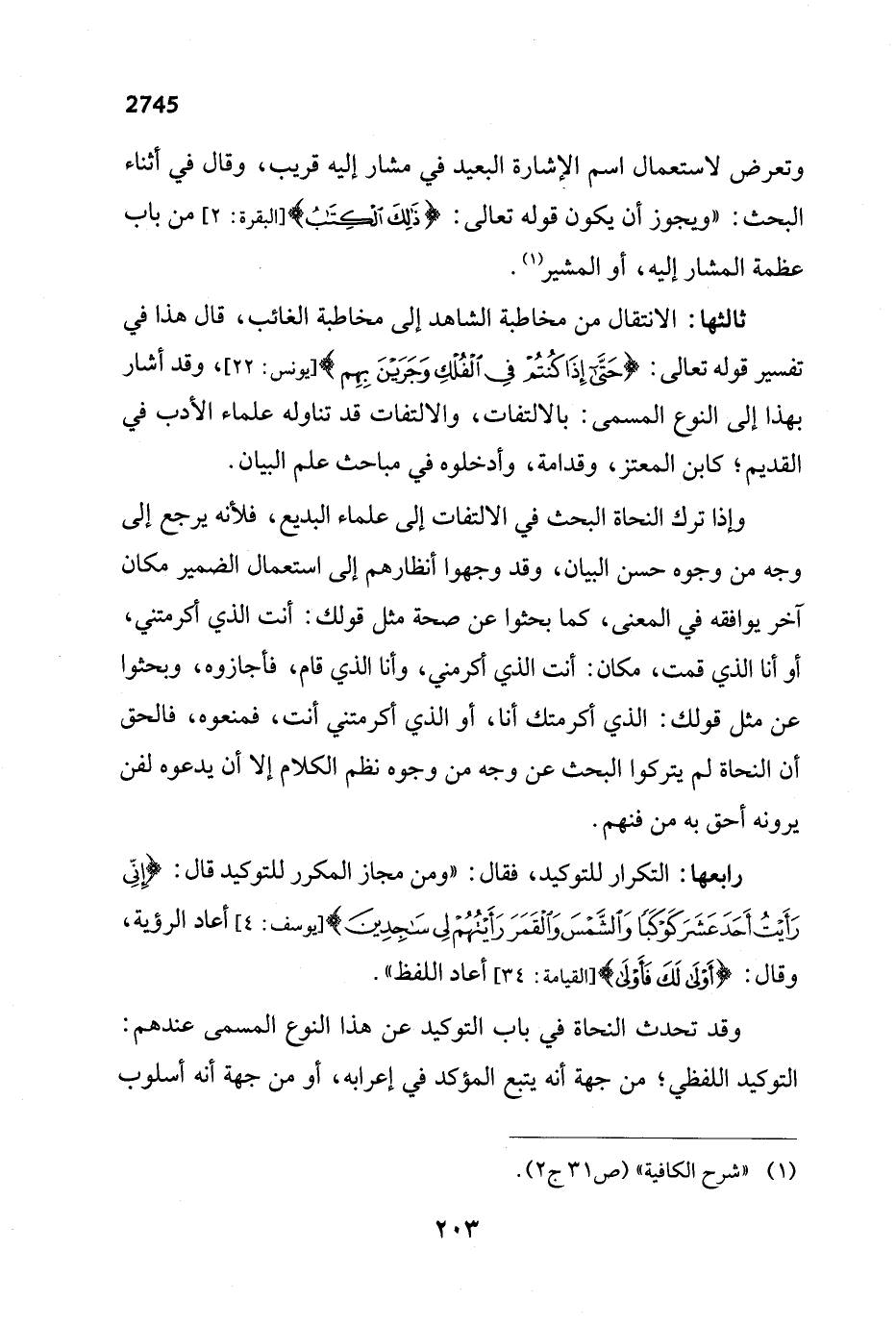 ثالثها: الانتقال من مخاطبة الشاهد إلى مخاطبة الغائب، قال هذا في تفسير قوله تعالى: {حَتَّى إِذَا كُنْتُمْ فِي الْفُلْكِ وَجَرَيْنَ بِهِمْ} [يونس: 2]، وقد أشار بهذا إلى النوع المسمى: بالالتفات، والالتفات قد تناوله علماء الأدب في القديم؛ كابن المعتز، وقدامة، وأدخلوه في مباحث علم البيان.