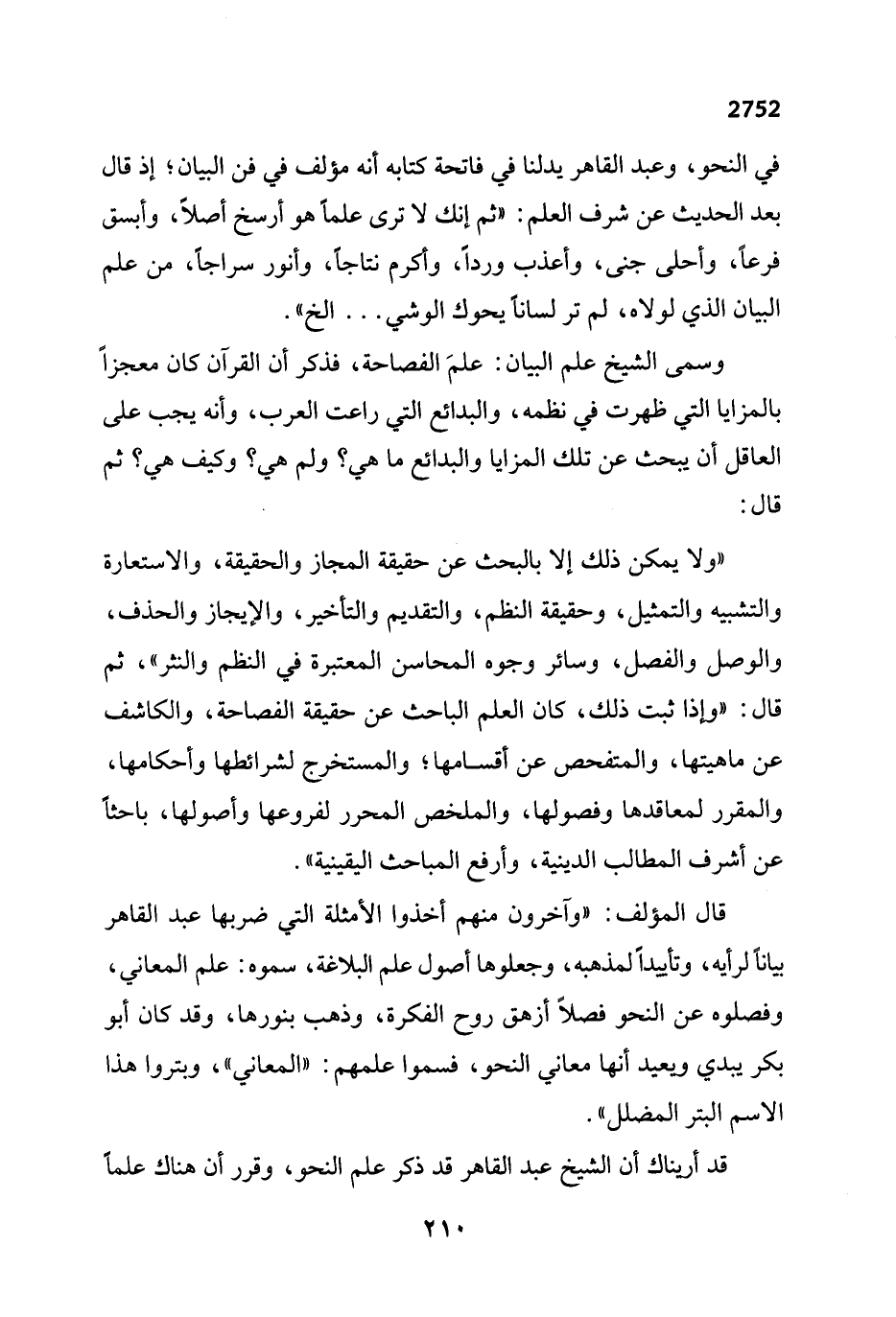 "ولا يمكن ذلك إلا بالبحث عن حقيقة المجاز والحقيقة، والاستعارة والتشبيه والتمثيل، وحقيقة النظم، والتقديم والتأخير، والإيجاز والحذف، والوصل والفصل، وسائر وجوه المحاسن المعتبرة في النظم والنثر"، ثم قال: "وإذا ثبت ذلك، كان العلم الباحث عن حقيقة الفصاحة، والكاشف عن ماهيتها، والمتفحص عن أقسامها؛ والمستخرج لشرائطها وأحكامها، والمقرر لمعاقدها وفصولها، والملخص المحرر لفروعها وأصولها، باحثاً عن أشرف المطالب الدينية، وأرفع المباحث اليقينية".