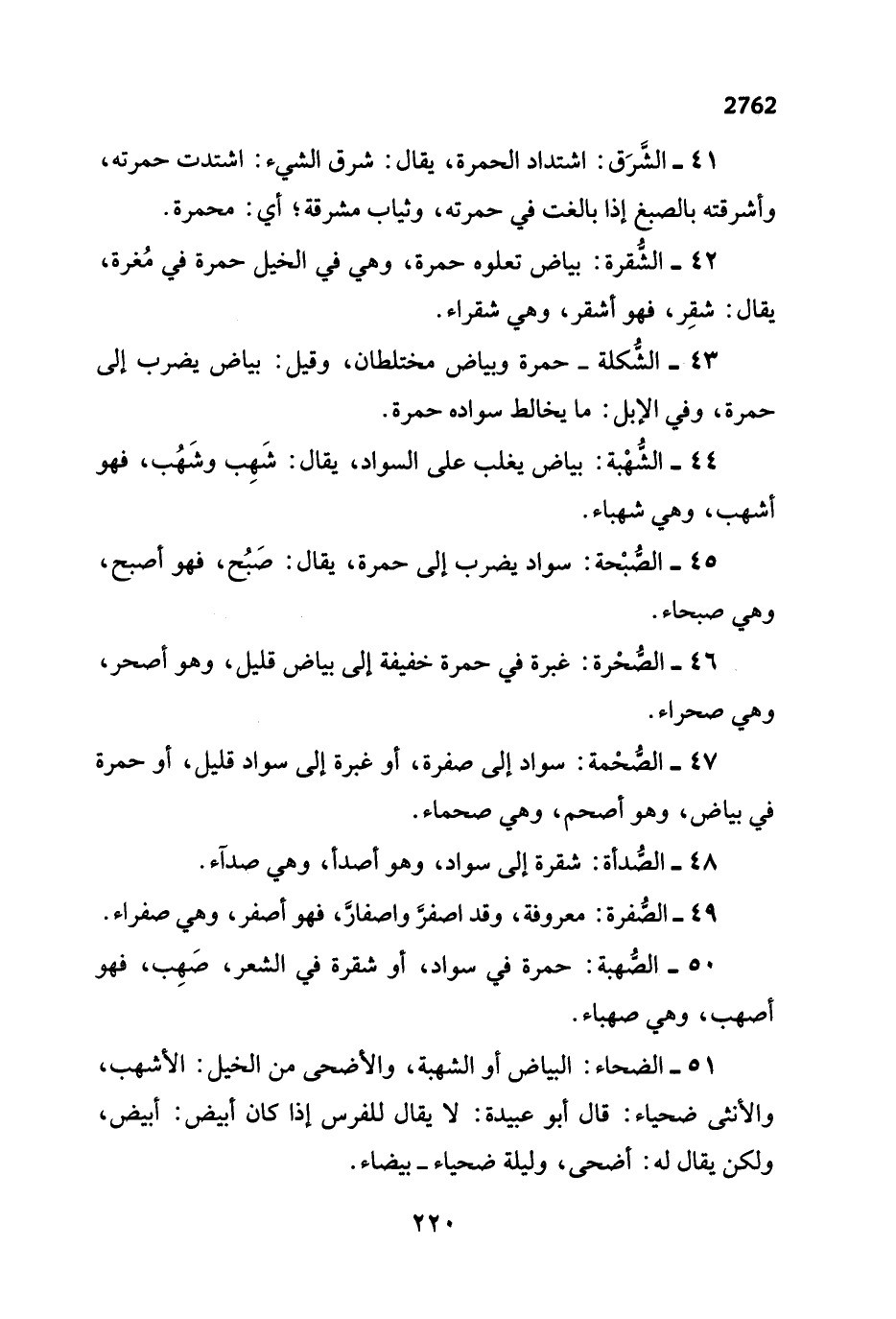 47 - الصُّحْمة: سواد إلى صفرة، أو غبرة إلى سواد قليل، أو حمرة في بياض، وهو أصحم، وهي صحماء.