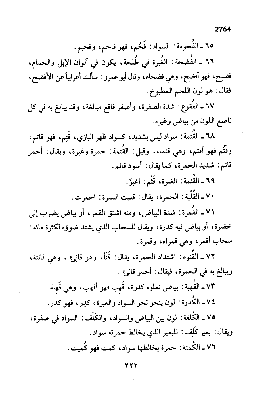 66 - الفُضحة: الغُبرة في طُلحة، يكون في ألوان الإبل والحمام، فضح، فهو أفضح، وهي فضحاء، وقال أبو عمرو: سألت أعرايياً عن الأفضح، فقال: هو لون اللحم المطبوخ.