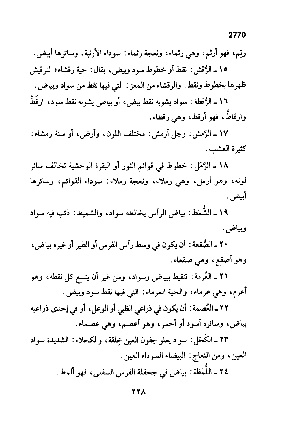 21 - العُرمة: تنقيط ببياض وسواد، ومن غير أن يتسع كل نقطة، وهو أعرم، وهي عرماء، والحية العرماء: التي فيها نقط سود وبيض.