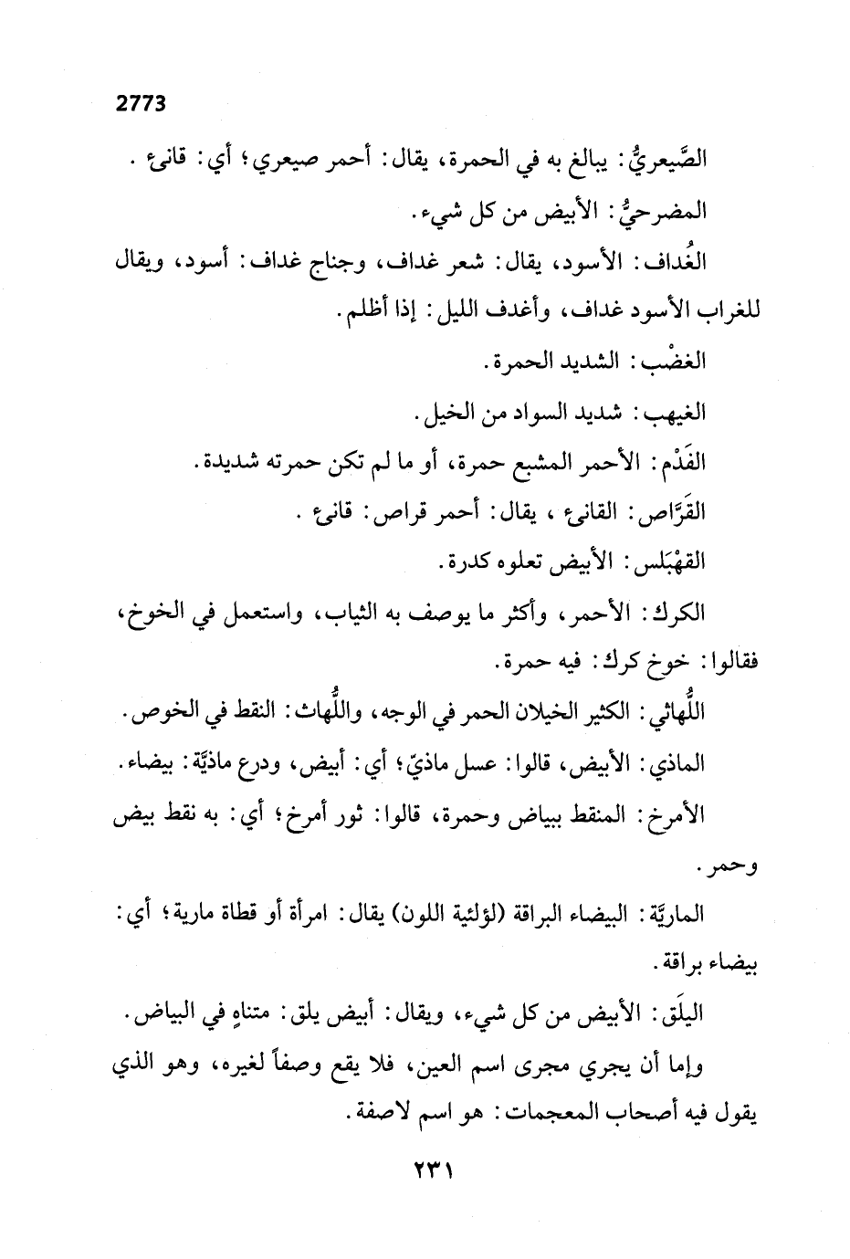 الصَّيعريُّ: يبالغ به في الحمرة، يقال: أحمر صيعري؛ أي: قانئ. المضرحيُّ: الأبيض من كل شيء.