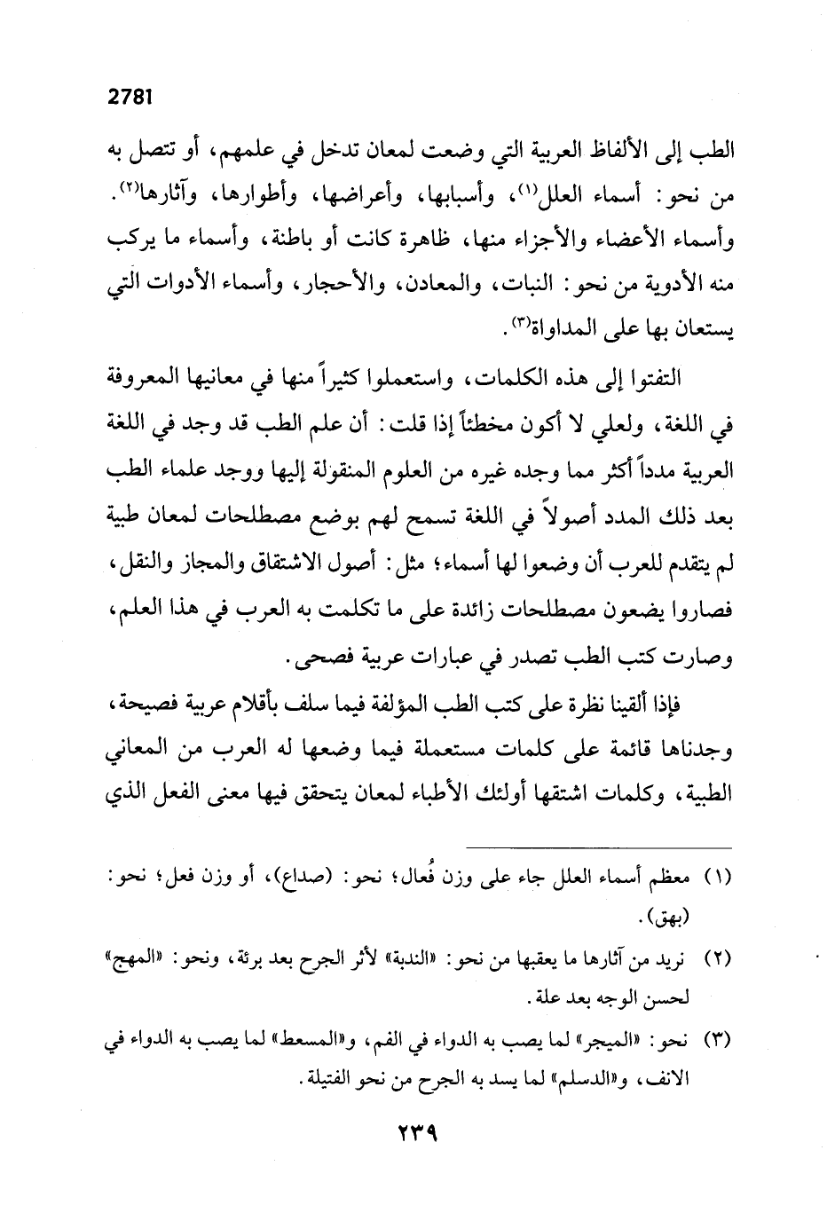 التفتوا إلى هذه الكلمات، واستعملوا كثيراً منها في معانيها المعروفة في اللغة، ولعلي لا أكون مخطئاً إذا قلت: أن علم الطب قد وجد في اللغة العربية مدداً أكثر مما وجده غيره من العلوم المنقولة إليها ووجد علماء الطب بعد ذلك المدد أصولاً في اللغة تسمح لهم بوضع مصطلحات لمعان طبية لم يتقدم للعرب أن وضعوا لها أسماء؛ مثل: أصول الاشتقاق والمجاز والنقل، فصاروا يضعون مصطلحات زائدة على ما تكلمت به العرب في هذا العلم، وصارت كتب الطب تصدر في عبارات عربية فصحى.