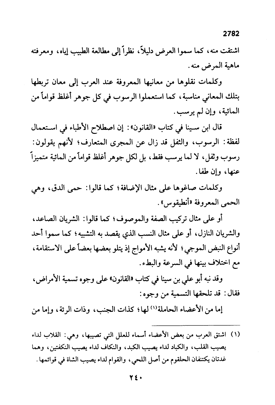 (¬1) اشتق العرب من بعض الأعضاء أسماء للعلل التي تصيبها، وهي: القلاب لداء يصيب القلب، والكباد لداء يصيب الكبد، والنكاف لداء يصيب النكفتين، وهما غدتان يكتنفان الحلقوم من أصل اللحي، والقوام لداء يصيب الشاة في قوائمها.