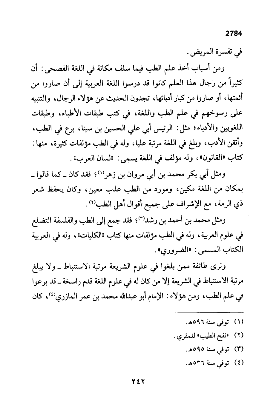 ونرى طائفة ممن بلغوا في علوم الشريعة مرتبة الاستنباط - ولا يبلغ مرتبة الاستنباط في الشريعة إلا من كان له في علوم اللغة قدم راسخة - قد برعوا في علم الطب، ومن هؤلاء: الإمام أبو عبد الله محمد بن عمر المازري (¬4)، كان