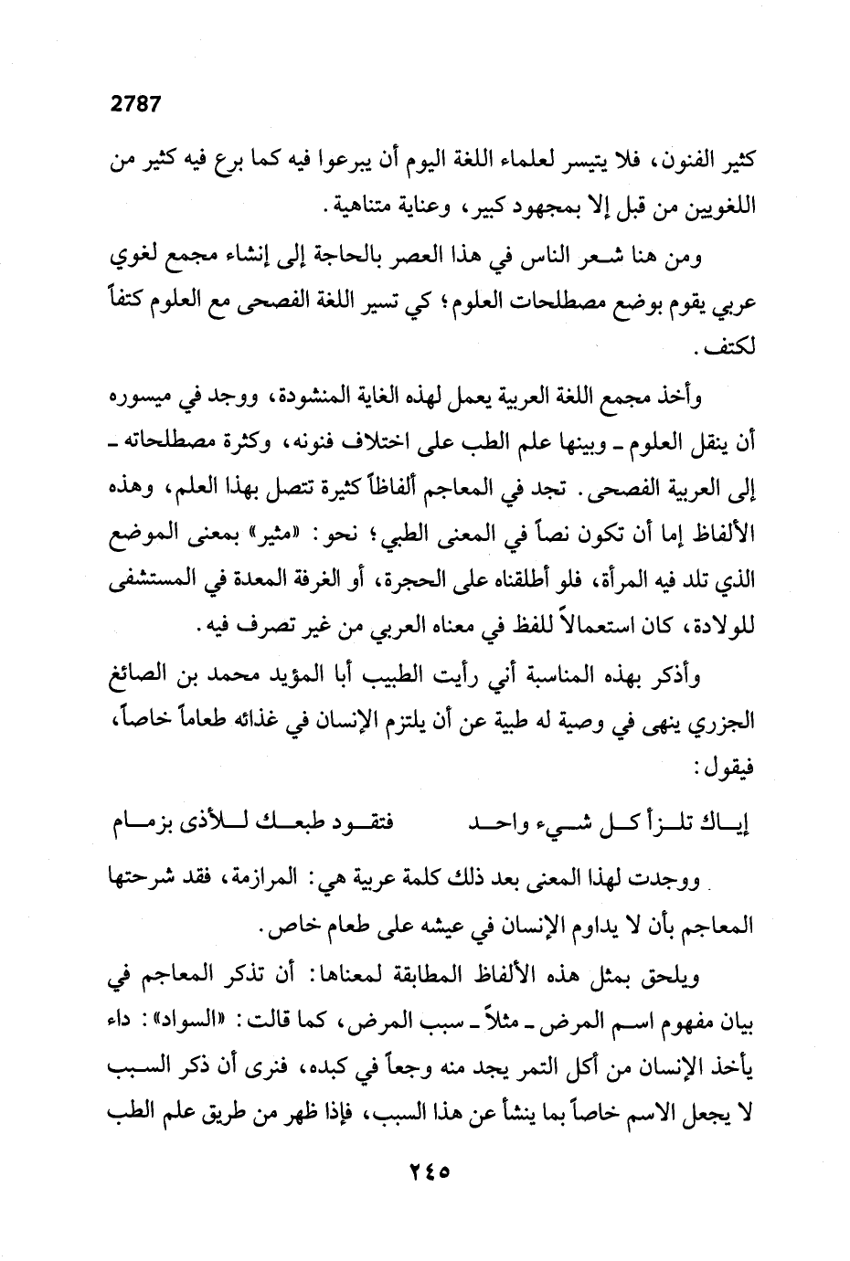 وأذكر بهذه المناسبة أني رأيت الطبيب أبا المؤيد محمد بن الصائغ الجزري ينهى في وصية له طبية عن أن يلتزم الإنسان في غذائه طعاماً خاصاً، فيقول: