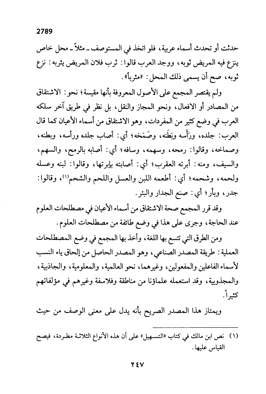 ومن الطرق التي تتسع بها اللغة، وأخذ بها المجمع في وضع المصطلحات العملية: طريقة المصدر الصناعي، وهو المصدر الحاصل من إلحاق ياء النسب لأسماء الفاعلين والمفعولين، وغيرهما، نحو العالمية، والمعلومية، والجاذبية، والمجذوبية، وقد استعمله علماؤنا من مناطقة وفلاسفة وغيرهم في مؤلفاتهم كثيراً.