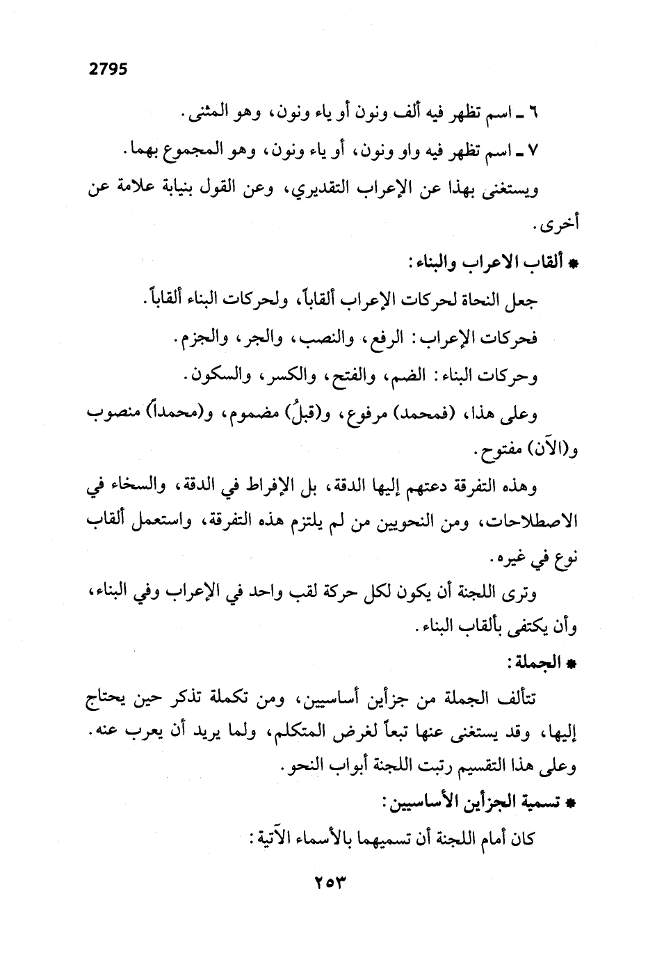 تتألف الجملة من جزأين أساسيين، ومن تكملة تذكر حين يحتاج إليها، وقد يستغنى عنها تبعًا لغرض المتكلم، ولما يريد أن يعرب عنه. وعلى هذا التقسيم رتبت اللجنة أبواب النحو.