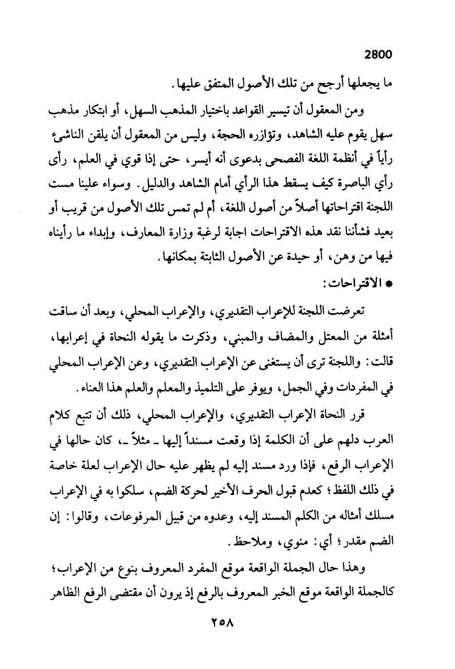 ومن المعقول أن تيسير القواعد باختيار المذهب السهل، أو ابتكار مذهب سهل يقوم عليه الشاهد، وتؤازره الحجة، وليس من المعقول أن يلقن الناشئ رأياً في أنظمة اللغة الفصحى بدعوى أنه أيسر، حتى إذا قوي في العلم، رأى رأي الباصرة كيف يسقط هذا الرأي أمام الشاهد والدليل. وسواء علينا مست اللجنة اقتراحاتها أصلاً من أصول اللغة، أم لم تمس تلك الأصول من قريب أو بعيد فشأننا نقد هذه الاقتراحات اجابة لرغبة وزارة المعارف، وإبداء ما رأيناه فيها من وهن، أو حيدة عن الأصول الثابتة بمكانها.