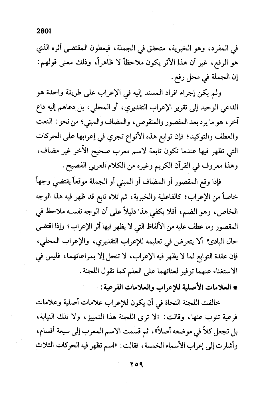 فإذا وقع المقصور أو المضاف أو المبني أو الجملة موقعًا يقتضي وجهاً خاصًا من الإعراب؛ كالفاعلية والخبرية، ثم تلاه تابم قد ظهر فيه هذا الوجه الخاص، وهو الضم، أفلا يكفي هذا دليلاً على أن الوجه نفسه ملاحظ في المقصور وما عطف عليه من الألفاظ التي لا يظهر فيها أثر الإعراب؛ وإذا اقتضى حال البادئ ألا يتعرض في تعليمه للإعراب التقديري، والإعراب المحلي، فإن عقدة التوابع لما لا يظهر فيه الإعراب، لا تنحل إلا بمراعاتهما، فليس في الاستغناء عنهما توفير لعنائهما على العلم كما تقول اللجنة.