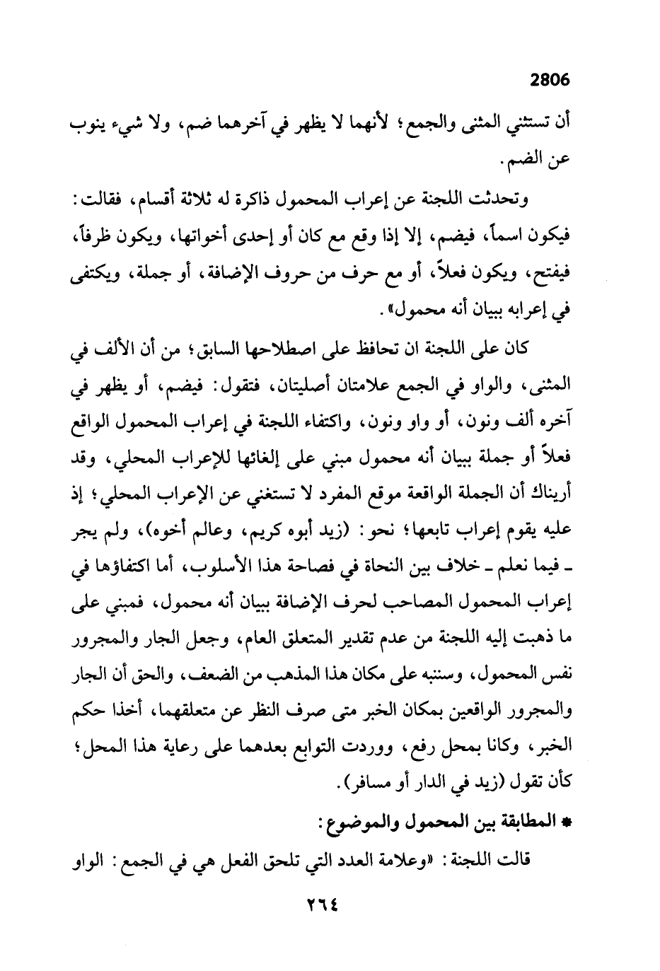 كان على اللجنة ان تحافظ على اصطلاحها السابق؛ من أن الألف في المثنى، والواو في الجمع علامتان أصليتان، فتقول: فيضم، أو يظهر في آخره ألف ونون، أو واو ونون، واكتفاء اللجنة في إعراب المحمول الواقع فعلاً أو جملة ببيان أنه محمول مبني على إلغائها للإعراب المحلي، وقد أريناك أن الجملة الواقعة موقع المفرد لا تستغني عن الإعراب المحلي؛ إذ عليه يقوم إعراب تابعها؛ نحو: (زيد أبوه كريم، وعالم أخوه)، ولم يجر - فيما نعلم - خلاف بين النحاة في فصاحة هذا الأسلوب، أما اكتفاؤها في إعراب المحمول المصاحب لحرف الإضافة ببيان أنه محمول، فمبني على ما ذهبت إليه اللجنة من عدم تقدير المتعلق العام، وجعل الجار والمجرور نفس المحمول، وسننبه على مكان هذا المذهب من الضعف، والحق أن الجار والمجرور الواقعين بمكان الخبر متى صرف النظر عن متعلقهما، أخذا حكم الخبر، وكانا بمحل رفع، ووردت التوابع بعدهما على رعاية هذا المحل؛ كأن تقول (زيد في الدار أو مسافر).