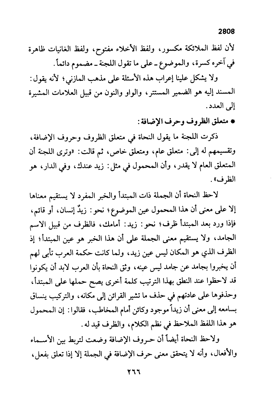 ذكرت اللجنة ما يقول النحاة في متعلق الظروف وحروف الإضافة، وتقسيمهم له إلى: متعلق عام، ومتعلق خاص، ثم قالت: "وترى اللجنة أن المتعلق العام لا يقدر، وأن المحمول في مثل: زيد عندك، وفي الدار، هو الظرف".
