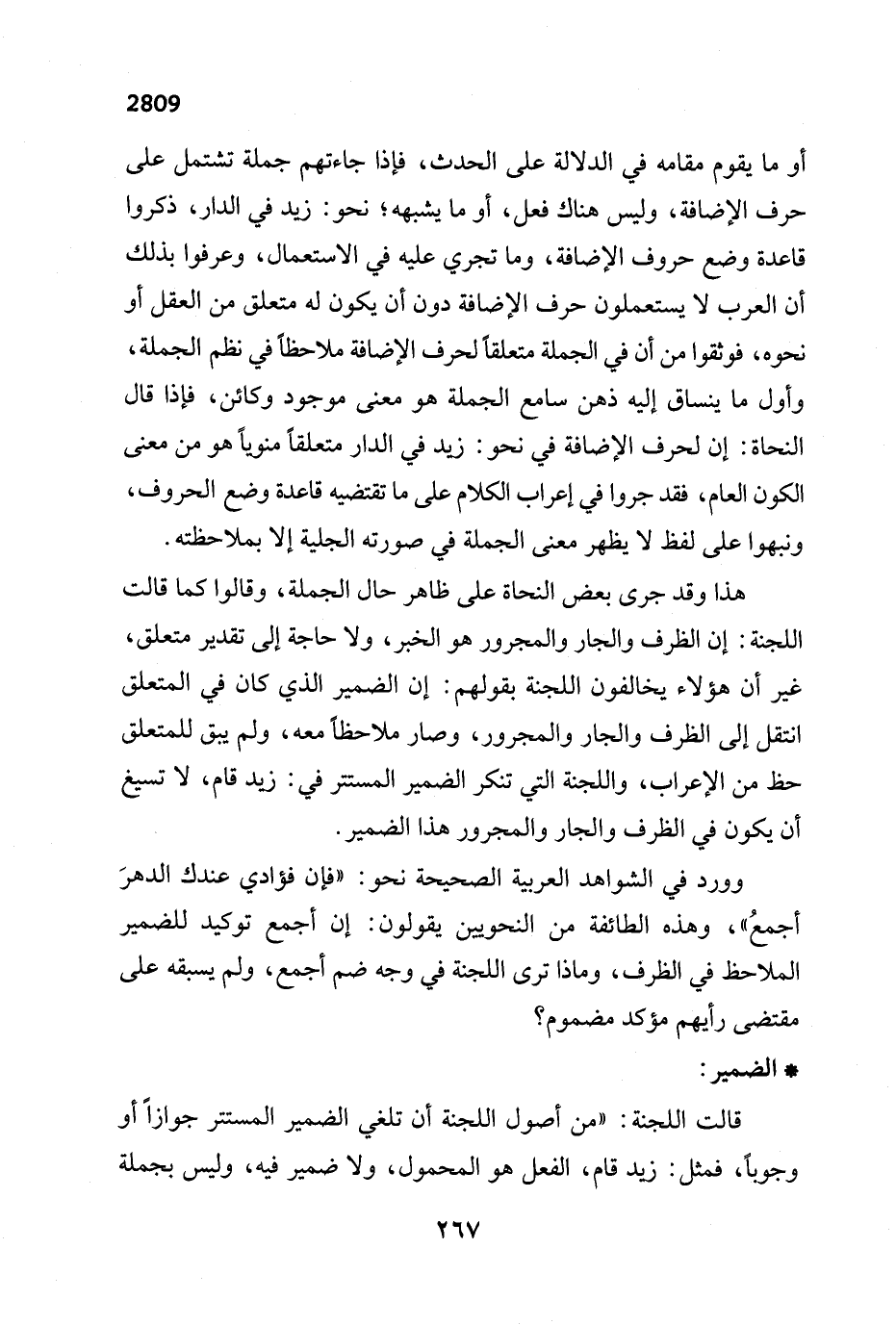 هذا وقد جرى بعض النحاة على ظاهر حال الجملة، وقالوا كما قالت اللجنة: إن الظرف والجار والمجرور هو الخبر، ولا حاجة إلى تقدير متعلق، غير أن هؤلاء يخالفون اللجنة بقولهم: إن الضمير الذي كان في المتعلق انتقل إلى الظرف والجار والمجرور، وصار ملاحظًا معه، ولم يبق للمتعلق حظ من الإعراب، واللجنة التي تنكر الضمير المستتر في: زيد قام، لا تسيغ أن يكون في الظرف والجار والمجرور هذا الضمير.