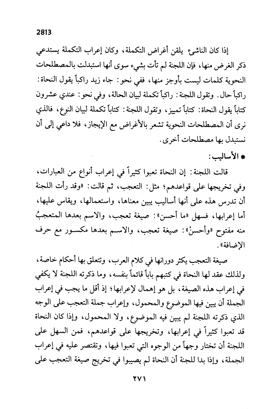 صيغة التعجب يكثر دورانها في كلام العرب، وتتعلق بها أحكام خاصة، ولذلك عقد لها النحاة في كتبهم باباً قائماً بنفسه، وما ذكرته اللجنة لا يكفي في إعراب هذه الصيغة، بل هو إهمال لإعرابها؛ إذ أقل ما يجب في إعراب الجملة أن يبين فيها الموضوع والمحمول، وإعراب جملة التعجب على الوجه الذي ذكرته اللجنة لم يبين فيه الموضوع، ولا المحمول، وإذا كان النحاة قد تعبوا كثيراً في إعرابها، وتخريجها على قواعدهم، فمن السهل على اللجنة أن تختار وجهاً من الوجوه التي تعبوا فيها، وتقتصر عليه في إعراب الجملة، وإذا بدا للجنة أن النحاة لم يصيبوا في تخريج صيغة التعجب على