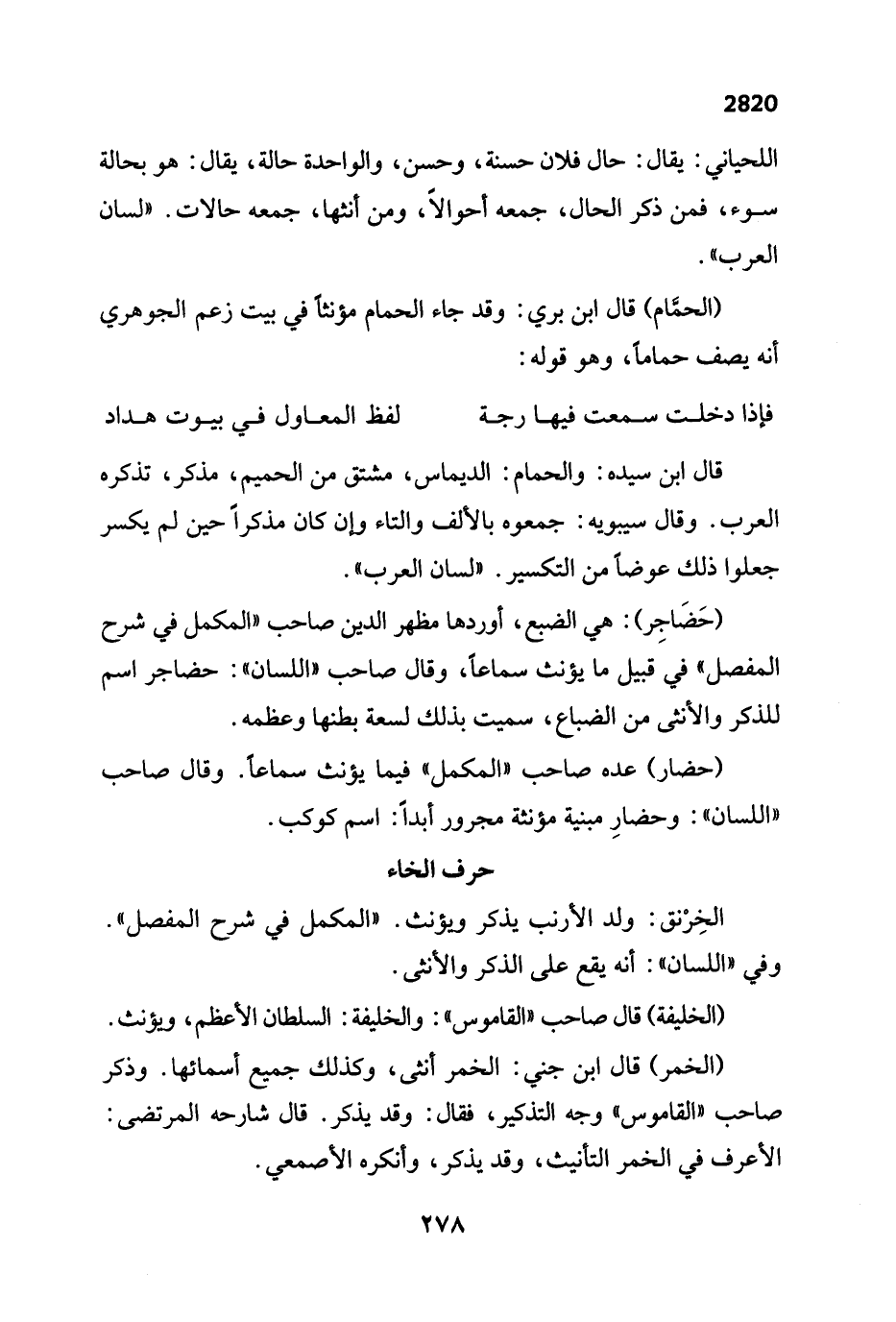 (الخمر) قال ابن جني: الخمر أنثى، وكذلك جميع أسمائها. وذكر صاحب "القاموس" وجه التذكير، فقال: وقد يذكر. قال شارحه المرتضى: الأعرف في الخمر التأنيث، وقد يذكر، وأنكره الأصمعي.