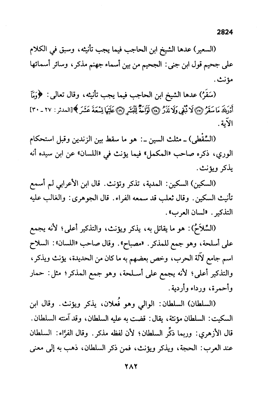 (السلطان) السلطان: الوالي وهو فُعلان، يذكر ويؤنث. وقال ابن السكيت: السلطان مؤنثة، يقال: قضت به عليه السلطان، وقد آمنته السلطان. قال الأزهري: وربما ذكر السلطان؛ لأن لفظه مذكر. وقال الفرَّاء: السلطان عند العرب: الحجة، ويذكر ويؤنث، فمن ذكر السلطان، ذهب به إلى معنى
