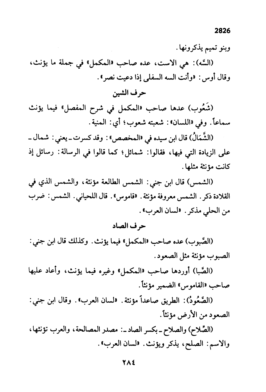 (الشمس) قال ابن جني: الشمس الطالعة مؤنثة، والشمس الذي في القلادة ذكر. الشمس معروفة مؤنثة. "قاموس". قال اللحياني. الشمس: ضرب من الحلي مذكر. "لسان العرب".