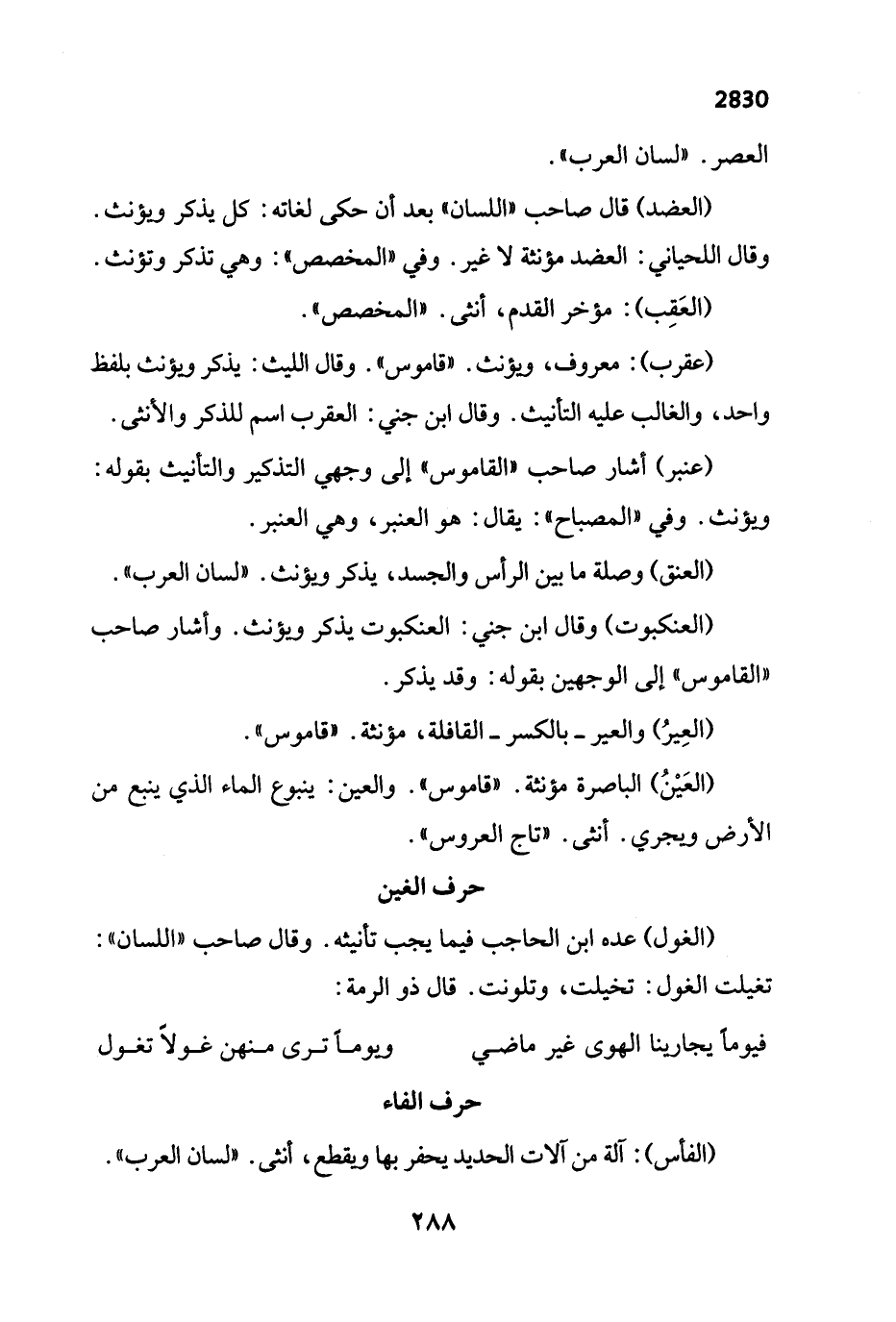 (العضد) قال صاحب "اللسان" بعد أن حكى لغاته: كل يذكر ويؤنث. وقال اللحياني: العضد مؤنثة لا غير. وفي "المخصص": وهي تذكر وتؤنث.