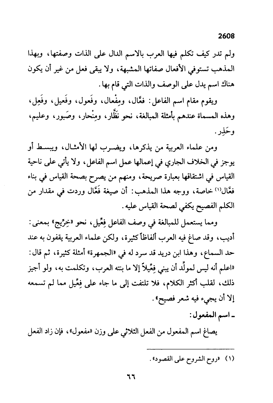 ومن علماء العربية من يذكرها، ويضرب لها الأمثال، ويبسط أو يوجز في الخلاف الجاري في إعمالها عمل اسم الفاعل، ولا يأتي على ناحية القياس في اشتقاقها بعبارة صريحة، ومنهم من يصرح بصحة القياس في بناء فعَّال (¬1) خاصة، ووجه هذا المذهب: أن صيغة فَعَّال وردت في مقدار من الكلم الفصيح يكفي لصحة القياس عليه.