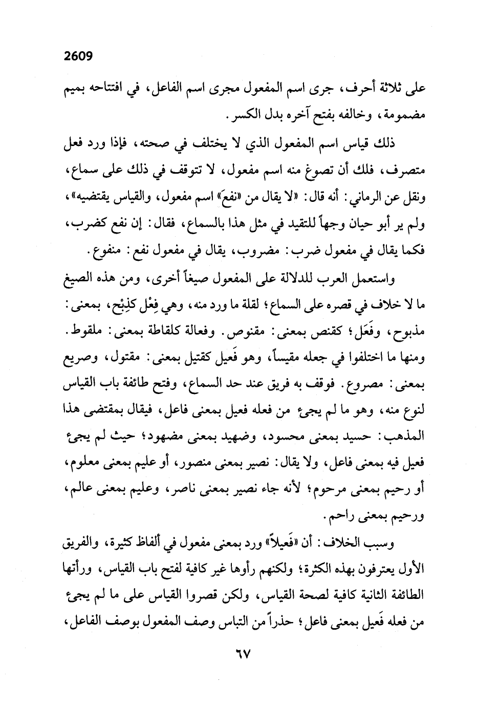 واستعمل العرب للدلالة على المفعول صيغاً أخرى، ومن هذه الصيغ ما لا خلاف في قصره على السماع؛ لقلة ما ورد منه، وهي فِعْل كذِبْح، بمعنى: مذبوح، وفَعَل؛ كقنص بمعنى: مقنوص. وفعالة كلقاطة بمعنى: ملقوط. ومنها ما اختلفوا في جعله مقيساً، وهو فَعيل كقتيل بمعنى: مقتول، وصريع بمعنى: مصروع. فوقف به فريق عند حد السماع، وفتح طائفة باب القياس لنوع منه، وهو ما لم يجئ من فعله فعيل بمعنى فاعل، فيقال بمقتضى هذا المذهب: حسيد بمعنى محسود، وضهيد بمعنى مضهود؛ حيث لم يجئ فعيل فيه بمعنى فاعل، ولا يقال: نصير بمعنى منصور، أو عليم بمعنى معلوم، أو رحيم بمعنى مرحوم؛ لأنه جاء نصير بمعنى ناصر، وعليم بمعنى عالم، ورحيم بمعنى راحم.