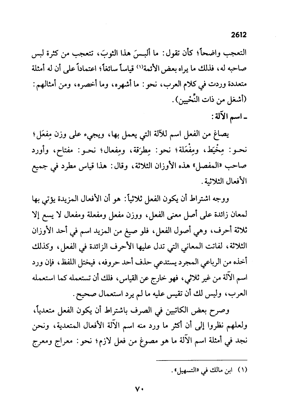 يصاغ من الفعل اسم للآلة التي يعمل بها، ويجيء على وزن مِفعَل؛ نحو: مِخْيَط، ومِفْعَلة؛ نحو: مِطرَقة، ومِفعال؛ نحو: مفتاح، وأورد صاحب "المفصل" هذه الأوزان الثلاثة، وقال: هذا قياس مطرد في جميع الأفعال الثلاثية.