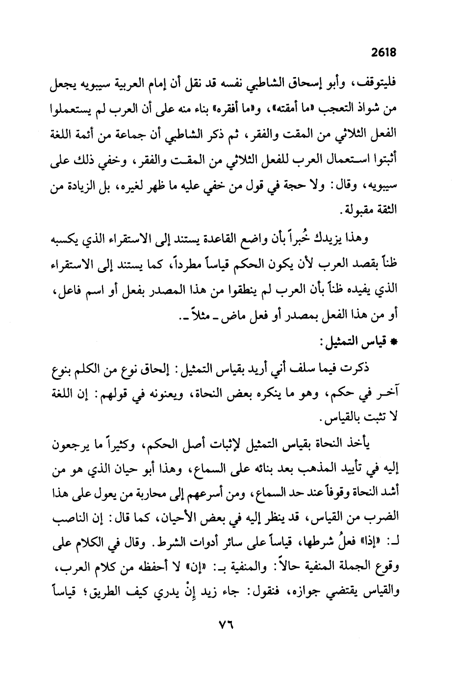 فليتوقف، وأبو إسحاق الشاطبي نفسه قد نقل أن إمام العربية سيبويه يجعل من شواذ التعجب "ما أمقته"، و "ما أفقره" بناء منه على أن العرب لم يستعملوا الفعل الثلاثي من المقت والفقر، ثم ذكر الشاطبي أن جماعة من أئمة اللغة أثبتوا استعمال العرب للفعل الثلاثي من المقت والفقر، وخفي ذلك على سيبويه، وقال: ولا حجة في قول من خفي عليه ما ظهر لغيره، بل الزيادة من الثقة مقبولة.
