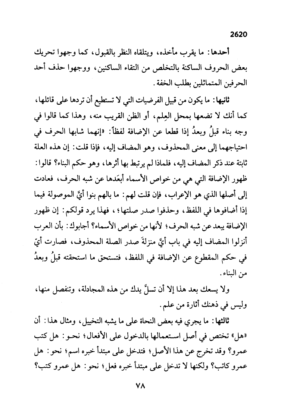 ثانيها: ما يكون من قبيل الفرضيات التي لا تستطيع أن تردها على قائلها، كما أنك لا تضعها بمحل العِلم، أو الظن القريب منه، وهذا كما قالوا في وجه بناء قبلُ وبعدُ إذا قطعا عن الإضافة لفظاً: "إنهما شابها الحرف في احتياجهما إلى معنى المحذوف، وهو المضاف إليه، فإذا قلت: إن هذه العلة ثابتة عند ذكر المضاف إليه، فلماذا لم يرتبط بها أثرها، وهو حكم البناء؟ قالوا: ظهور الإضافة التي هي من خواص الأسماء أبعَدها عن شبه الحرف، فعادت إلى أصلها الذي هو الإعراب، فإن قلت لهم: ما بالهم بنوا أيَّ الموصولة فيما إذا أضافوها في اللفظ، وحذفوا صدر صلتها؛، فهذا يرد قولكم: إن ظهور الإضافة يبعد عن شبه الحرف؛ لأنها من خواص الأسماء؟ أجابوك: بأن العرب أنزلوا المضاف إليه في باب أيَّ منزلةَ صدر الصلة المحذوف، فصارت أيّ في حكم المقطوع عن الإضافة في اللفظ، فتستحق ما استحقته قبلُ وبعدُ من البناء.