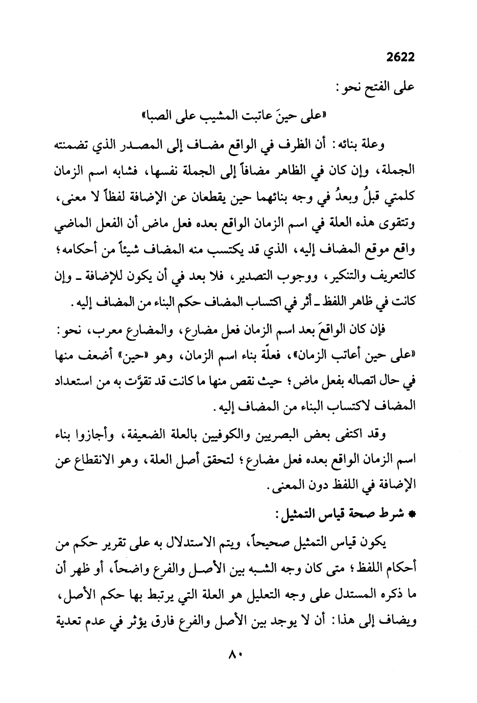 وعلة بنائه: أن الظرف في الواقع مضاف إلى المصدر الذي تضمنته الجملة، وإن كان في الظاهر مضافاً إلى الجملة نفسها، فشابه اسم الزمان كلمتي قبلُ وبعدُ في وجه بنائهما حين يقطعان عن الإضافة لفظاً لا معنى، وتتقوى هذه العلة في اسم الزمان الواقع بعده فعل ماض أن الفعل الماضي واقع موقع المضاف إليه، الذي قد يكتسب منه المضاف شيئاً من أحكامه؛ كالتعريف والتنكير، ووجوب التصدير، فلا بعد في أن يكون للإضافة - وإن كانت في ظاهر اللفظ - أثر في كتساب المضاف حكم البناء من المضاف إليه.