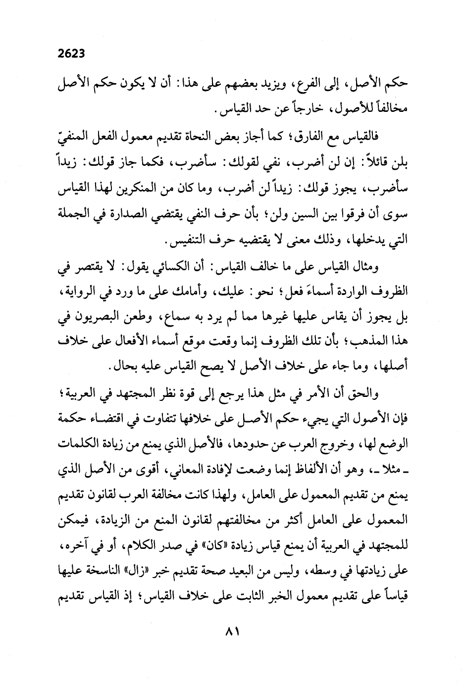 والحق أن الأمر في مثل هذا يرجع إلى قوة نظر المجتهد في العربية؛ فإن الأصول التي يجيء حكم الأصل على خلافها تتفاوت في اقتضاء حكمة الوضع لها، وخروج العرب عن حدودها، فالأصل الذي يمنع من زيادة الكلمات - مثلا-، وهو أن الألفاظ إنما وضعت لإفادة المعاني، أقوى من الأصل الذي يمنع من تقديم المعمول على العامل، ولهذا كانت مخالفة العرب لقانون تقديم المعمول على العامل أكثر من مخالفتهم لقانون المنع من الزيادة، فيمكن للمجتهد في العربية أن يمنع قياس زيادة "كان" في صدر الكلام، أو في آخره، على زيادتها في وسطه، وليس من البعيد صحة تقديم خبر "زال" الناسخة عليها قياساً على تقديم معمول الخبر الثابت على خلاف القياس؛ إذ القياس تقديم