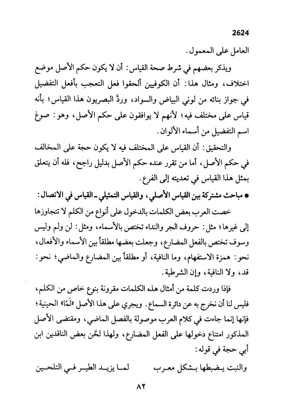 ويذكر بعضهم في شرط صحة القياس: أن لا يكون حكم الأصل موضع اختلاف، ومثال هذا: أن الكوفيين ألحقوا فعل التعجب بأفعل التفضيل في جواز بنائه من لوني البياض والسواد، وردَّ البصريون هذا القياس؛ بأنه قياس على مختلف فيه؛ لأنهم لا يوافقون على حكم الأصل، وهو: صوغ اسم التفضيل من أسماء الألوان.