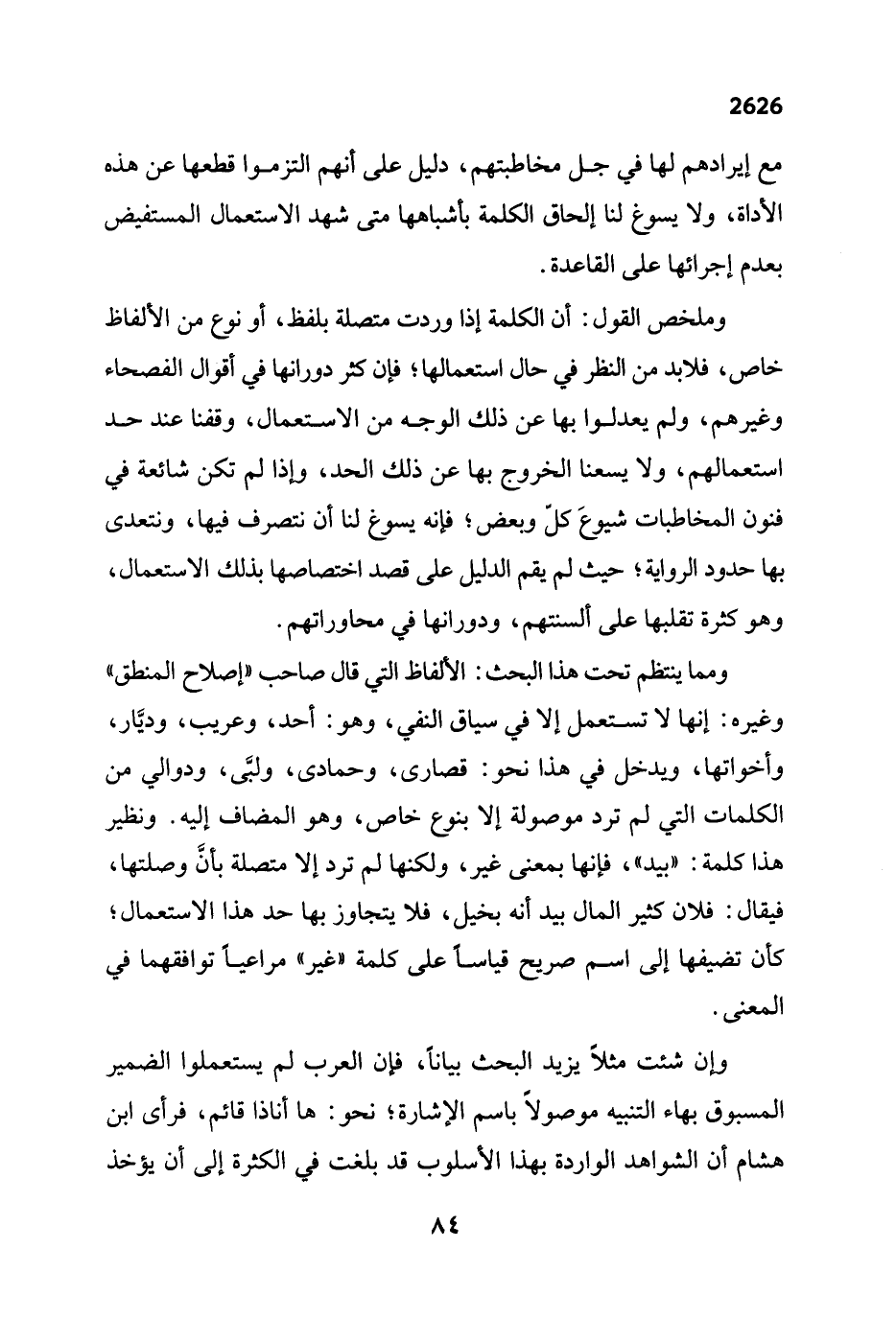 ومما ينتظم تحت هذا البحث: الألفاظ التي قال صاحب "إصلاح المنطق" وغيره: إنها لا تستعمل إلا في سياق النفي، وهو: أحد، وعريب، وديَّار، وأخواتها، ويدخل في هذا نحو: قصارى، وحمادى، ولبَّى، ودوالي من الكلمات التي لم ترد موصولة إلا بنوع خاص، وهو المضاف إليه. ونظير هذا كلمة: "بيد"، فإنها بمعنى غير، ولكنها لم ترد إلا متصلة بأنَّ وصلتها، فيقال: فلان كثير المال بيد أنه بخيل، فلا يتجاوز بها حد هذا الاستعمال؛ كان تضيفها إلى اسم صريح قياسا على كلمة "غير" مراعياً توافقهما في المعنى.