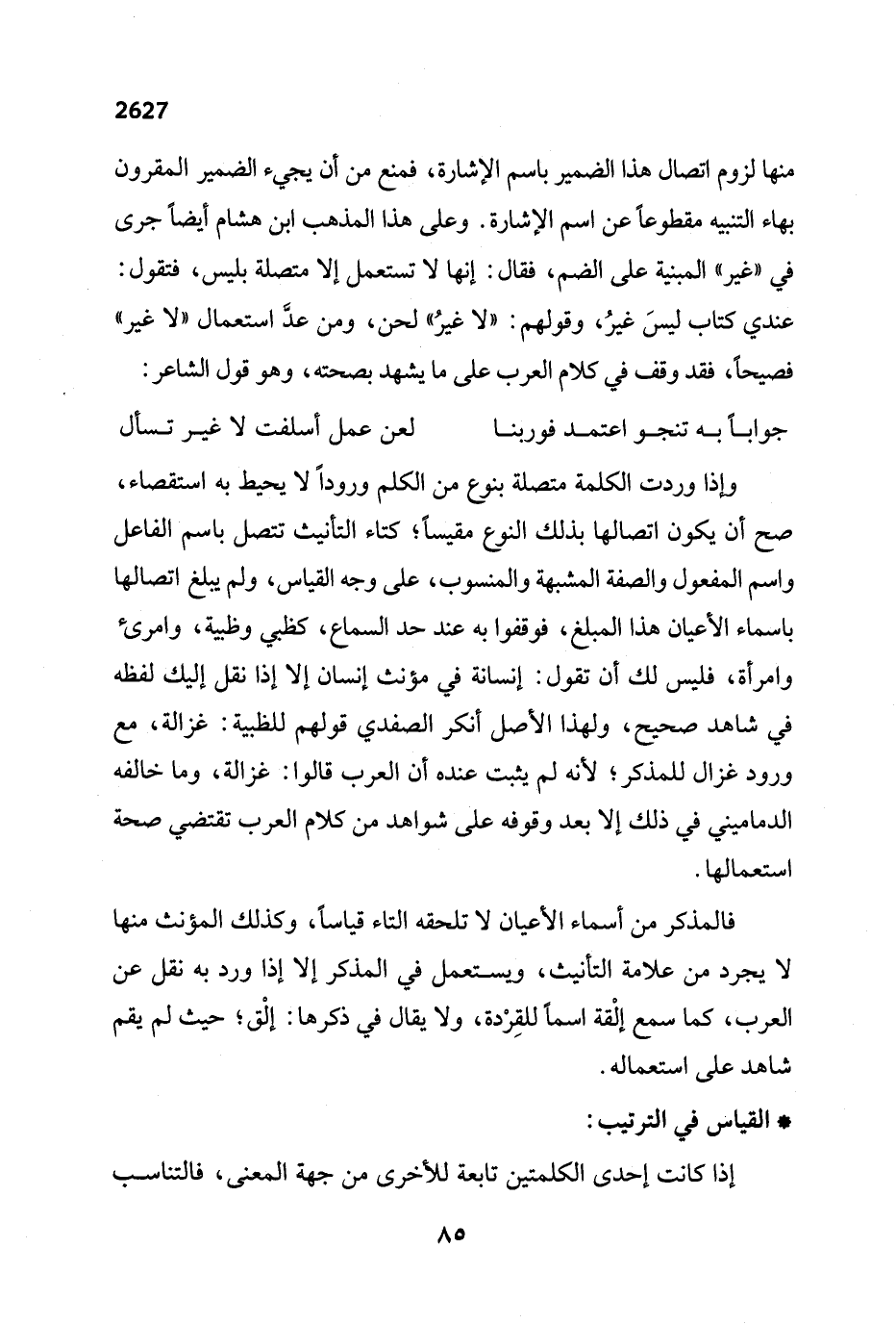 منها لزوم اتصال هذا الضمير باسم الإشارة، فمنع من أن يجيء الضمير المقرون بهاء التنبيه مقطوعًا عن اسم الإشارة. وعلى هذا المذهب ابن هشام أيضاً جرى في "غير" المبنية على الضم، فقال: إنها لا تستعمل إلا متصلة بليس، فتقول: عندي كتاب ليسَ غيرُ، وقولهم: "لا غيرُ" لحن، ومن عدَّ استعمال "لا غير" فصيحاً، فقد وقف في كلام العرب على ما يشهد بصحته، وهو قول الشاعر: