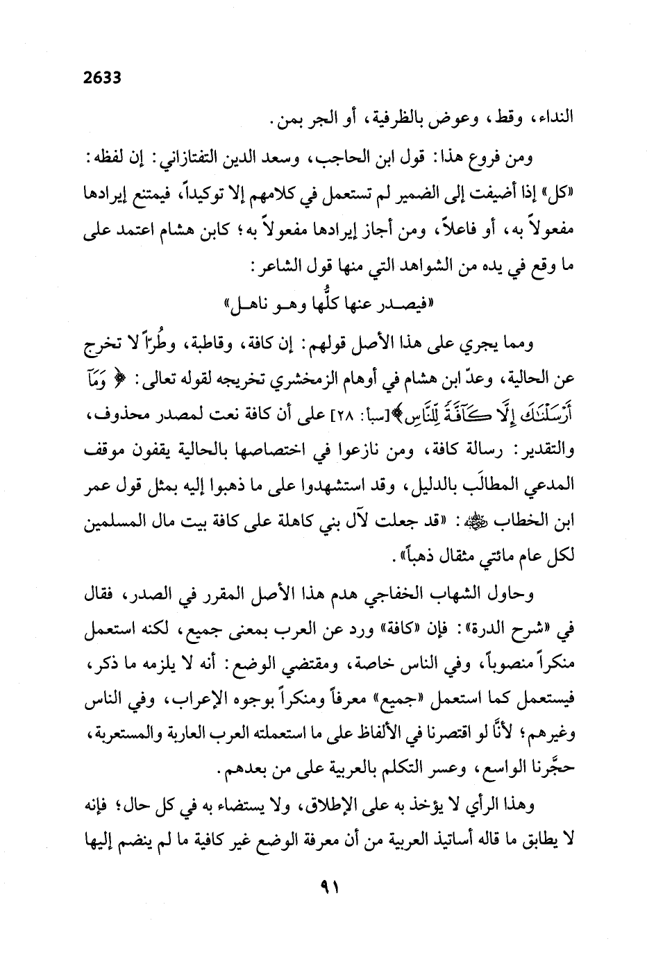 ومما يجري على هذا الأصل قولهم: إن كافة، وقاطبة، وطُرّاً لا تخرج عن الحالية، وعدّ ابن هشام في أوهام الزمخشري تخريجه لقوله تعالى: {وَمَا أَرْسَلْنَاكَ إِلَّا كَافَّةً لِلنَّاسِ} [سبأ: 28] على أن كافة نعت لمصدر محذوف، والتقدير: رسالة كافة، ومن نازعوا في اختصاصها بالحالية يقفون موقف المدعي المطالَب بالدليل، وقد استشهدوا على ما ذهبوا إليه بمثل قول عمر ابن الخطاب - رضي الله عنه -: "قد جعلت لآل بني كاهلة على كافة بيت مال المسلمين لكل عام مائتي مثقال ذهباً".