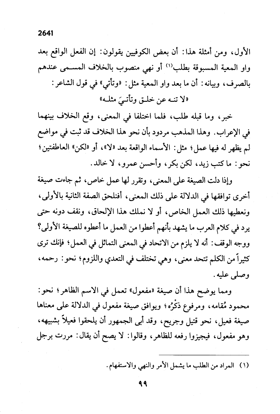 الأول، ومن أمثلة هذا: أن بعض الكوفيين يقولون: إن الفعل الواقع بعد واو المعية المسبوقة بطلب (¬1) أو نهي منصوب بالخلاف المسمى عندهم بالصرف، وبيانه: أن ما بعد واو المعية مثل: "وتأتي" في قول الشاعر: