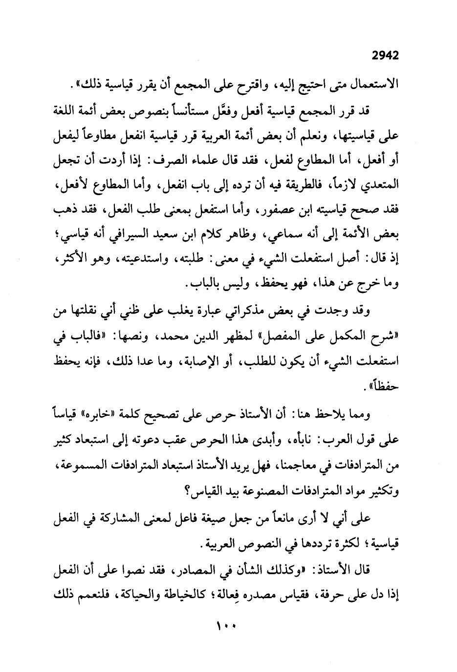 قد قرر المجمع قياسية أفعل وفعَّل مستأنساً بنصوص بعض أئمة اللغة على قياسيتها، ونعلم أن بعض أئمة العربية قرر قياسية انفعل مطاوعاً ليفعل أو أفعل، أما المطاوع لفعل، فقد قال علماء الصرف: إذا أردت أن تجعل المتعدي لازماً، فالطريقة فيه أن ترده إلى باب انفعل، وأما المطاوع لأفعل، فقد صحح قياسيته ابن عصفور، وأما استفعل بمعنى طلب الفعل، فقد ذهب بعض الأئمة إلى أنه سماعي، وظاهر كلام ابن سعيد السيرافي أنه قياسي؛ إذ قال: أصل استفعلت الشيء في معنى: طلبته، واستدعيته، وهو الأكثر، وما خرج عن هذا، فهو يحفظ، وليس بالباب.