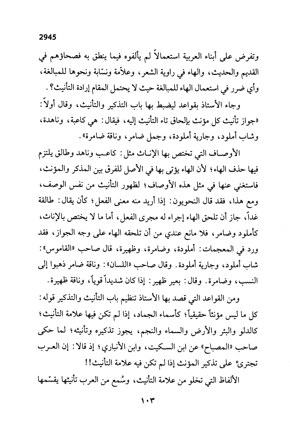 وتفرض على أبناء العربية استعمالاً لم يألفوه فيما ينطق به فصحاؤهم في القديم والحديث، والهاء في راوية الشعر، وعلاّمة ونسّابة ونحوها للمبالغة، وأي ضرر في استعمال الهاء للمبالغة حيث لا يحتمل المقام إرادة التأنيث؟. وجاء الأستاذ بقواعد ليضبط بها باب التذكير والتأنيث، وقال أولاً: "جواز تأنيث كل مؤنث بإلحاق تاء التأنيث إليه، فيقال: هي كاعبة، وناهدة، وشاب أملود، وجارية أملودة، وجمل ضامر، وناقة ضامرة".