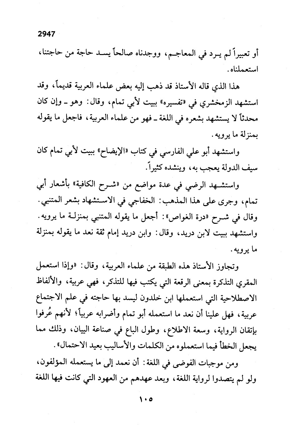 وتجاوز الأستاذ هذه الطبقة من علماء العربية، وقال: "وإذا استعمل المقري التذكرة بمعنى الرقعة التي يكتب فيها للتذكر، فهي عربية، والألفاظ الاصطلاحية التي استعملها ابن خلدون ليسد بها حاجته في علم الاجتماع عربية، فهل علينا أن نعد ما استعمله أبو تمام وأضرابه عربياً؛ لأنهم عُرفوا بإتقان الرواية، وسعة الاطلاع، وطول الباع في صناعة البيان، وذلك مما يجعل الخطأ فيما استعملوه من الكلمات والأساليب بعيد الاحتمال".