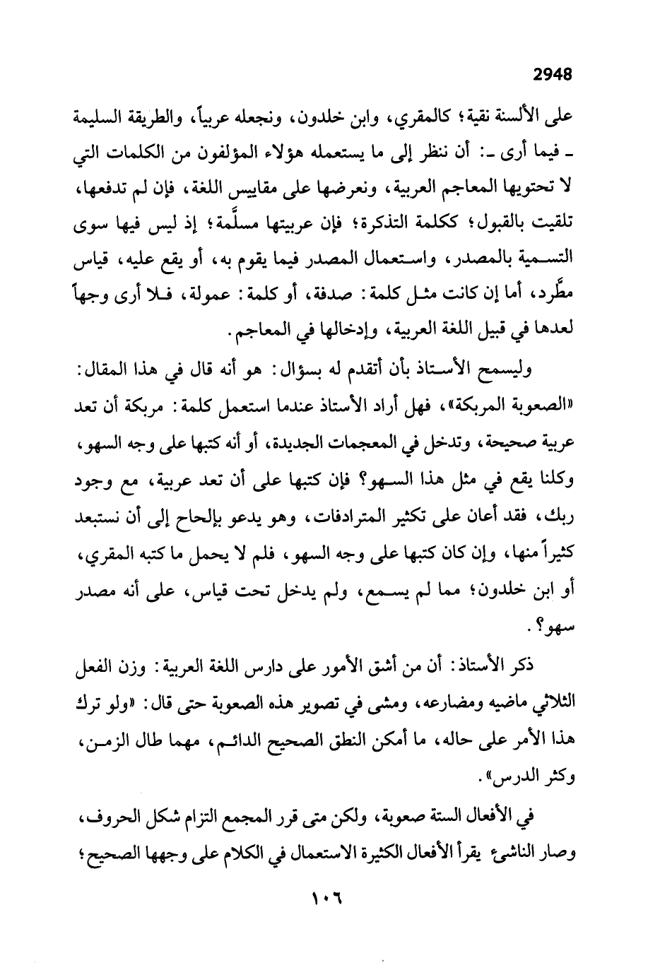 وليسمح الأستاذ بأن أتقدم له بسؤال: هو أنه قال في هذا المقال: "الصعوبة المربكة"، فهل أراد الأستاذ عندما استعمل كلمة: مربكة أن تعد عربية صحيحة، وتدخل في المعجمات الجديدة، أو أنه كتبها على وجه السهو، وكلنا يقع في مثل هذا السهو؟ فإن كتبها على أن تعد عربية، مع وجود ربك، فقد أعان على تكثير المترادفات، وهو يدعو بإلحاح إلى أن نستبعد كثيراً منها، وإن كان كتبها على وجه السهو، فلم لا يحمل ما كتبه المقري، أو ابن خلدون؛ مما لم يسمع، ولم يدخل تحت قياس، على أنه مصدر سهو؟.