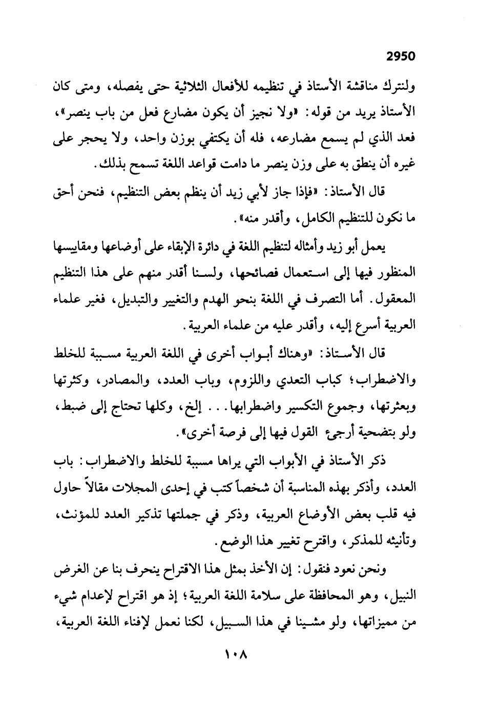 يعمل أبو زيد وأمثاله لتنظيم اللغة في دائرة الإبقاء على أوضاعها ومقاييسها المنظور فيها إلى استعمال فصائحها، ولسنا أقدر منهم على هذا التنظيم المعقول. أما التصرف في اللغة بنحو الهدم والتغيير والتبديل، فغير علماء العربية أسرع إليه، وأقدر عليه من علماء العربية.