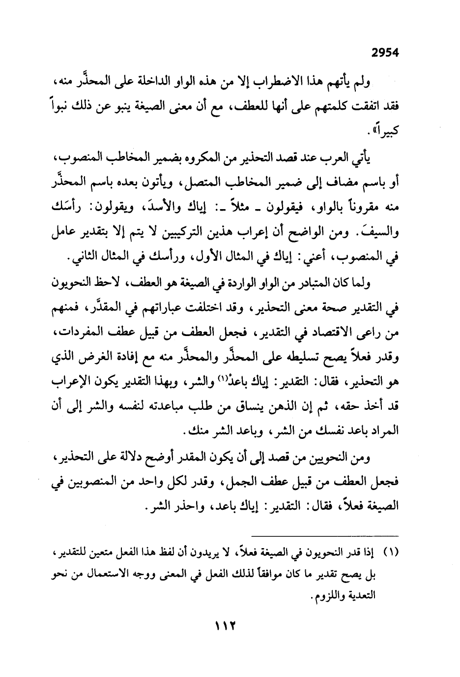 ولم يأتهم هذا الاضطراب إلا من هذه الواو الداخلة على المحذَّر منه، فقد اتفقت كلمتهم على أنها للعطف، مع أن معنى الصيغة ينبو عن ذلك نبواً كبيراً".
