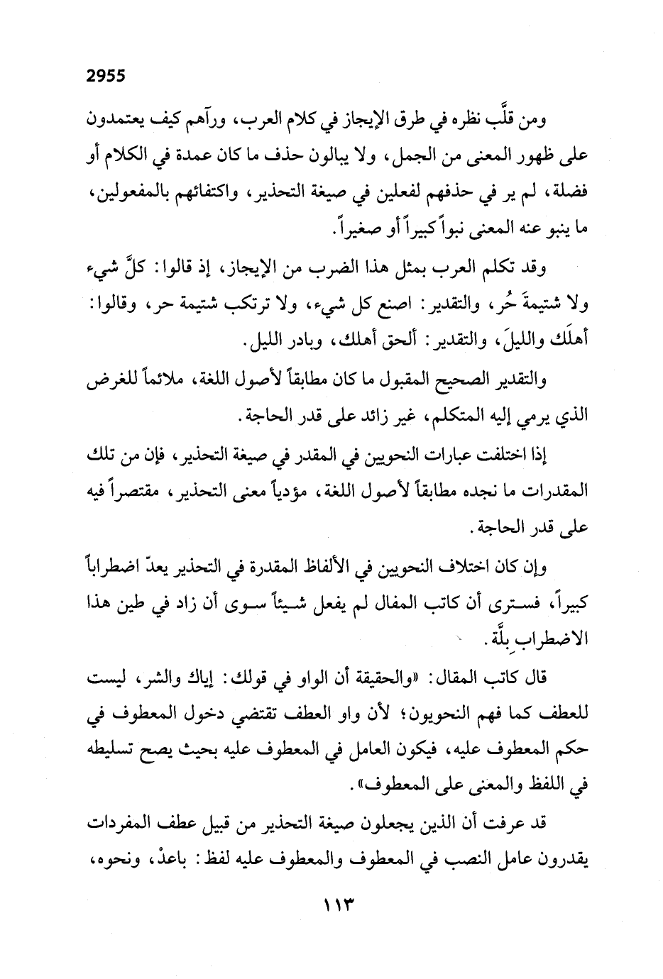 ومن قلَّب نظره في طرق الإيجاز في كلام العرب، ورآهم كيف يعتمدون على ظهور المعنى من الجمل، ولا يبالون حذف ما كان عمدة في الكلام أو فضلة، لم ير في حذفهم لفعلين في صيغة التحذير، واكتفائهم بالمفعولين، ما ينبو عنه المعنى نبواً كبيراً أو صغيراً.