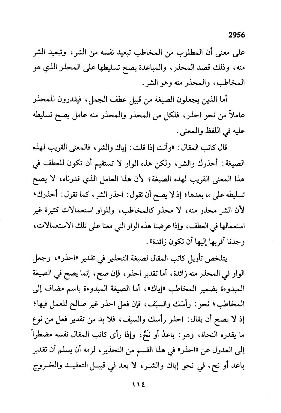 يتلخص تأويل كاتب المقال لصيغة التحذير في تقدير "احذر"، وجعل الواو في المحذر منه زائدة، أما تقدير احذر، فإن صح، إنما يصح في الصيغة المبدوءة بضمير المخاطب "إياك"، أما الصيغة المبدوءة باسم مضاف إلى المخاطب؛ نحو: رأسَك والسيَف، فإن فعل احذر غير صالح للعمل فيها؛ إذ لا يصح أن يقال: احذر رأسك والسيف، فلا بد من تقدير فعل من نوع ما يقدره النحاة، وهو: باعدْ أو نخِّ، وإذا رأى كاتب المقال نفسه مضطراً إلى العدول عن "احذر" في هذا القسم من التحذير، لزمه أن يسلم أن تقدير باعد أو نح، في نحو إياك والشر، لا يعد في قبيل التعقيد والخروج