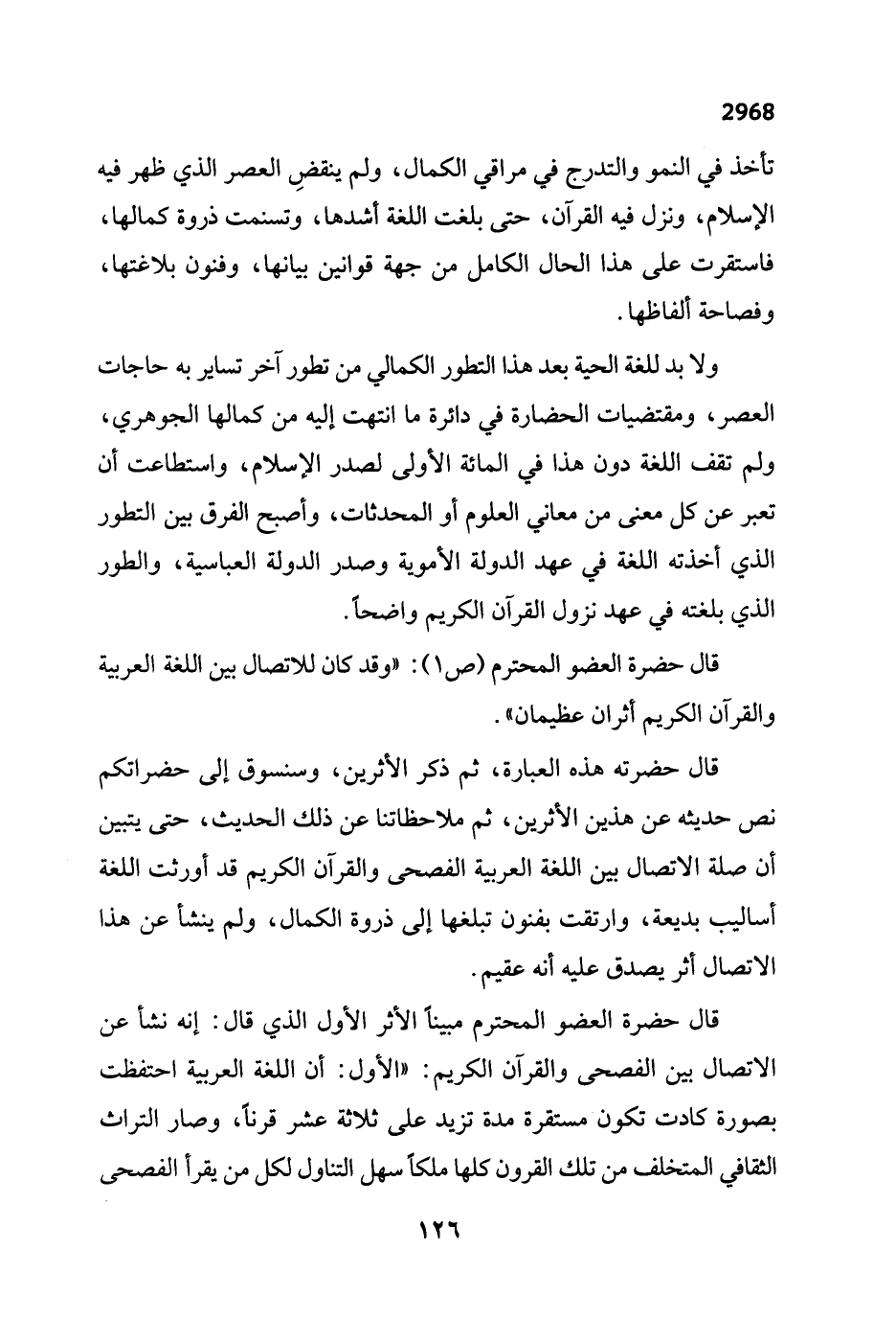 قال حضرة العضو المحترم مبيناً الأثر الأول الذي قال: إنه نشأ عن الاتصال بين الفصحى والقرآن الكريم: "الأول: أن اللغة العربية احتفظت بصورة كادت تكون مستقرة مدة تزيد على ثلاثة عشر قرناً، وصار التراث الثقافي المتخلف من تلك القرون كلها ملكاً سهل التناول لكل من يقرأ الفصحى